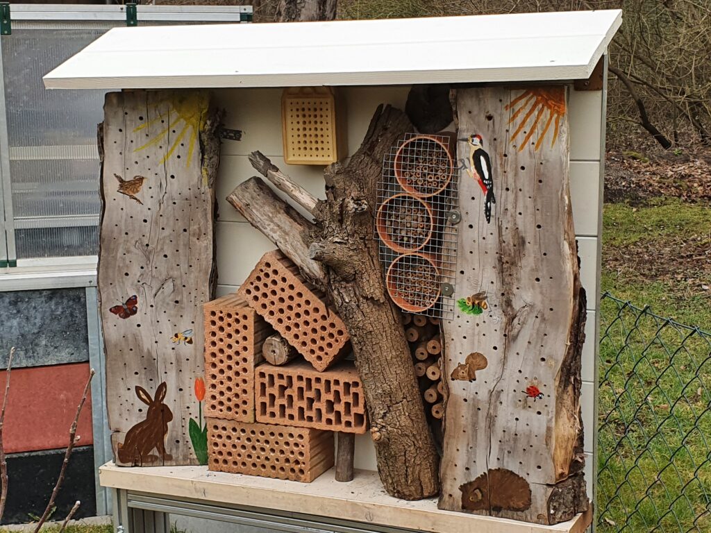 Selbst gebautes Insektenhotel aus 2 halbierten Baumstämmen und bemalt. Die Löcher müssen sorgfältig gebohrt werden, es dürfen keine Späne überstehen, da sich sonst die Insekten an den Flügeln verletzten. Weiter sind Ziegelsteine mit Rundlöchern verwendet, diese sind auch geschliffen, die quadratischen Ziegel sind für Schmetterlinge und sonstige Falter. Es sind auch Sektkorken verwendet und die Röhren die in den abgesägten Abwasserrohren eingesetzt sind, sind aus Bambus. Die Gitter vor den Röhren schützen die Insektenbrut vor Specht und andere Vögel mit spitzen Schnabel